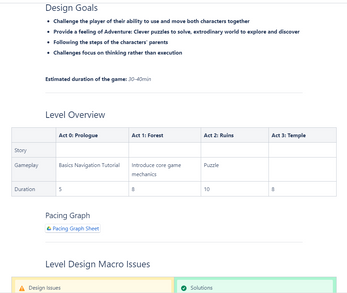 We used Confluence to write our design documentations. To start the creation of a level, I first established some design goals, then I defined the story and gameplay beats of the levels to achieve those goals.